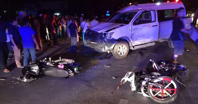 (本报民都鲁17日讯)四驱车转弯导致两辆摩托车煞车不及撞上四驱车,两名骑士伤势严重,其中一人恐瞎一只眼。