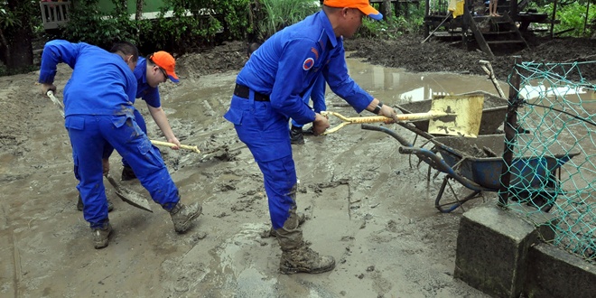 古晋民防局队伍今早派遣约30人前往石角甘榜辛纳布迪拉玛展开灾后清理工作,协助遭到水灾肆虐的甘榜清理堆积在路面上沙土和枯枝。