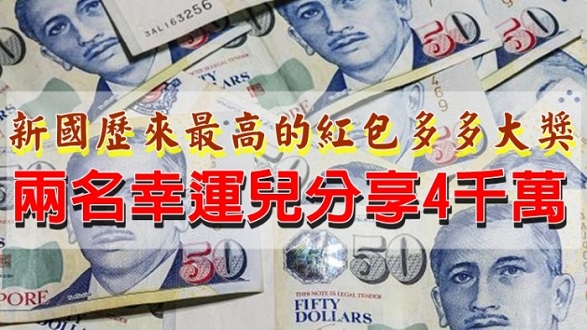 (新加坡19日讯)新加坡歷来最高的红包多多大奖昨晚开彩,高达1394万3682新元(约4183万1046令吉)的大奖,由两名幸运儿分享,各可分得近700万新元(2096万令吉)。