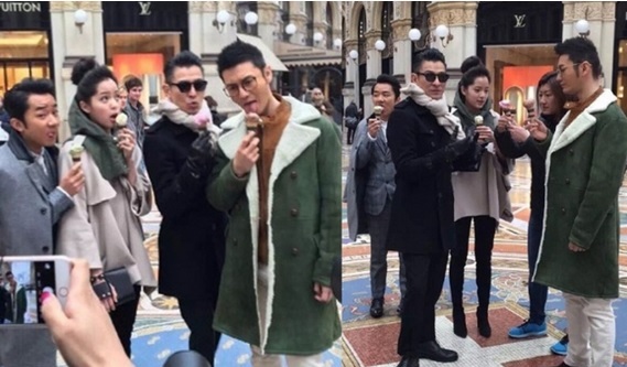 超幸运!有网友在米兰偶遇刘德华、黄晓明、欧阳娜娜和王祖蓝,4人穿著冬装在精品街上吃冰淇淋。华仔不愧是天王,穿得一身黑,戴墨镜、皮手套,再梳个all back油头,举手投足散发巨星味,而黄晓明戴著大眼镜伸舌舔冰,一秒泄呆萌本性。