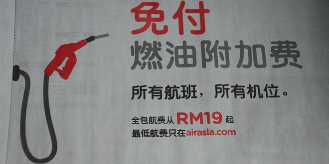 亚航今日在各大报章刊登广告,免付燃油附加费以吸引民众的注意,大力促销全球各地的往来航班机票。亚航这项免燃油附加费的优惠只到2月1日结束。