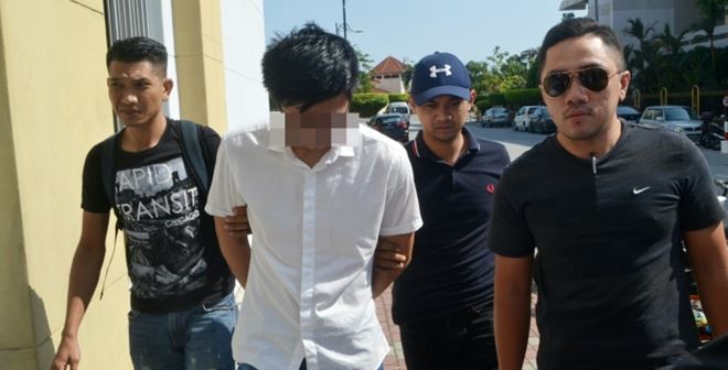 18岁的中国籍嫌犯今日在3名警员的扣押下,被带上庭申请延长扣留,嫌犯全程情绪平稳,只是低著头躲避媒体的镜头,代表律师雷尔则陪伴在旁。