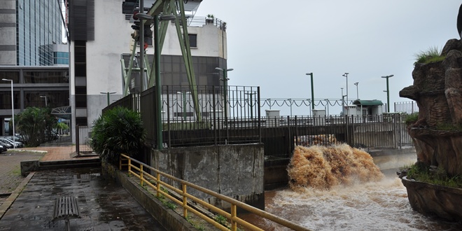 巡视市区内的抽水站,不时都会发现其发挥抽水的功能,满满的内陆黑色雨水被抽到江中,雨水倒入江中的水势惊人。