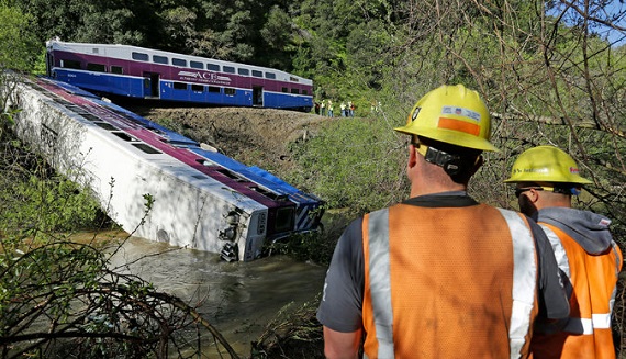 一列名为ACE (Altamont Corridor Express))的通勤火车,行驶至加州苏诺尔(Sunol)时,火车突然脱轨,其中一节车厢撞入附近河流。