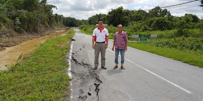 砂拉越中砂 当局须尽快修复 罗马安桥下陷 2015年1月27日 罗马安桥下路面下陷情况。 (本报诗巫26日讯)诗巫区国会议员林财耀与党员于日前前往西岸罗马安一带视察当地的水灾情况。Advertisement 他发现罗马安桥下的路边,有严重下陷的情况。 林财耀表示,有关下陷路段的情况非常严重,深度高达数英寸,长度长达数米。 他说,电单车骑士或其他道路使用者,万一不小心驶入下陷的路段,导致交通工具爆胎或失控冲入沟渠内,那后果就不堪设想了。 他吁请乡村议会尽快修复有关下陷路段,确保有关路段的道路使用者的安全不会受到威胁。
