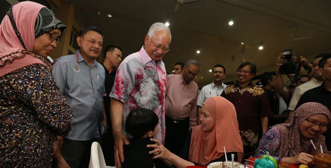 纳吉在参观食坊美食摊食时主动与摊贩和民众握手,亲民的态度也吸引民众们纷纷掏出手机与首相合照。