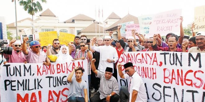 (布城18日讯 )大马非政府组织联合会拿督嘉玛尤诺斯率领约500人,聚集在前首相敦马哈迪的首要领导基金会办公室,提交反对《公民宣言》的备忘录。