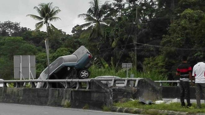 砂拉越南砂 轿车倒插桥梁缝隙 2016年3月21日 失控插撞入缝隙的国产英雄轿车。 晋连路35哩路段,昨早发生一起有惊无险车祸。Advertisement 一辆行驶中的国产英雄轿车,驶经上述桥上路段时失控撞上路墩,连人带车插入分界处桥壁缝隙中,动弹不得,所幸司机与乘客均无恙。