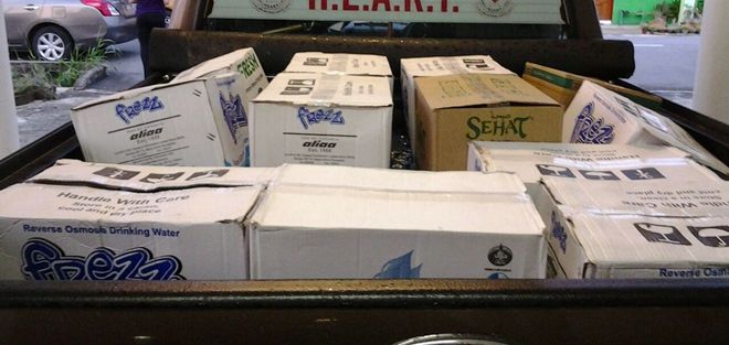 四个单位工作人员,今早聚集在斯市青年中心,将大量矿泉水、干粮和衣服,搬上汶莱四驱车协会成员的四驱车上,准时在9时20分从青年中心出发。