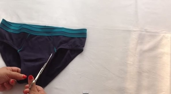 教学内容可以看到,用剪刀沿着内裤缝线的内侧裁开,保留了缝线较厚实的部位,把中间的布料都移除后,就可以看到一件小背心成形了,而整个制作流程花不到1分钟时间。