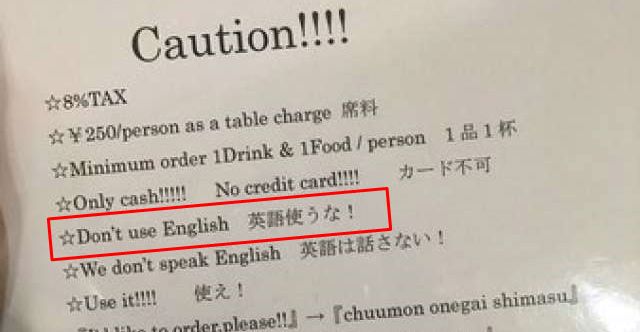 日本观光客逐年增加,但许多人都知道部分日本人的英文不太好,面对外来观光客的增加,遇到英语的机率势必会更多。然而最近却传出东京一家餐厅明文贴「禁止客人说英语」的公告,引发网友热议。