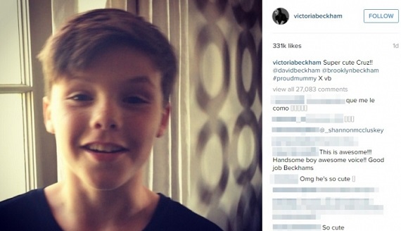 综合报导,维多利亚14日在Instagram上贴一段影片,影片里是她最小的儿子克鲁兹演唱《Hopeful》一曲,除了音准都有到位外,转音更是令许多人起鸡皮疙瘩,稚嫩的嗓音配上摸胸口的手势,萌翻所有人。她情不自禁表示「太可爱了!骄傲地妈咪」更標记她老公柏罕和大儿子布鲁克林,影片曝光后,立刻引起关注。
