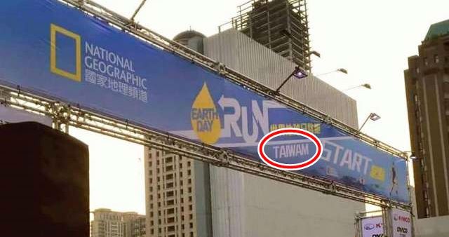 国家地理频道主办「世界地球日─为地球退烧」环保路跑活动在台湾台中市举办,有民眾发现路跑点拱门上的台湾英文字眼拼成「TAIWAM(应为TAIWAN)」,主办单位坦承疏漏、道歉。
