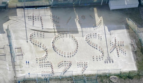 综合日媒报导,国府高中於16日地震后开放附近居民避难,但卫生纸、水、麵包等民生物资缺乏,於是学生决定用椅子在校园內排字求援,斗大的SOS字样在空拍时被发现后,日本网民立刻帮忙转发,救援物资18日终於送抵该校,学生也將用来求援的椅子撤走了。