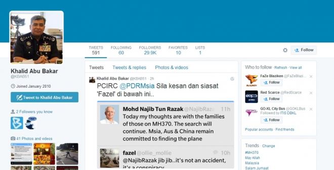 首相纳吉於昨晚透过推文对MH370事件致哀,並承诺搜寻工作將持续进行,然而巫裔网民「Fazel」却留言指这不是失事,而是场阴谋。卡立今日针对此事指示网络警察调查反应中心,调查及追查此人下落。