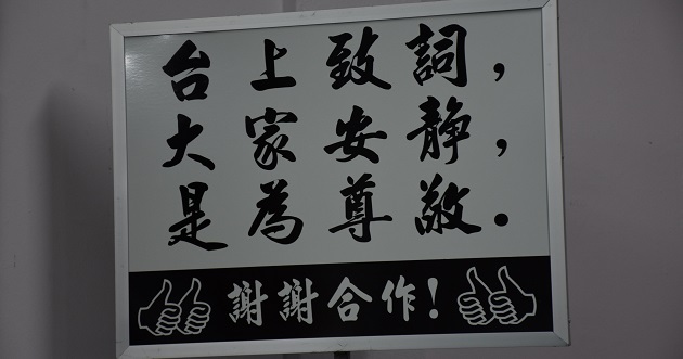 这样的镜头,在任何活动上都常见,为了让台下的群众能尊重台上的讲员,诗巫某公会不得不制作一个告示牌,上面写着“台上致词,大家安静,是为尊敬”,每逢台下声浪高的时候,就有人举牌到他面前,让他一时尴尬不已。