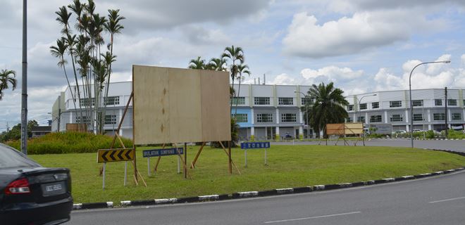 今早,市区内主要车道,包括在甘榜希礼的宋溪玛奥前方的交通岛,可见到看板木架竖起。