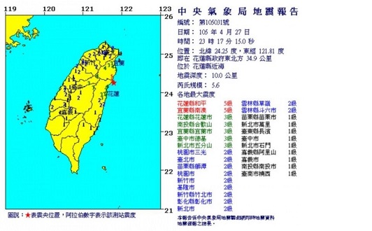 (台北28日讯)台湾中央气象局地震测报中心报告指出,週三晚间11时17分,花莲近海发生芮氏规模5.6地震,威力相当於1/8颗原子弹,而紧接著又连续发生6起余震,规模从3.5到4.7不等,几乎摇醒半个台湾。