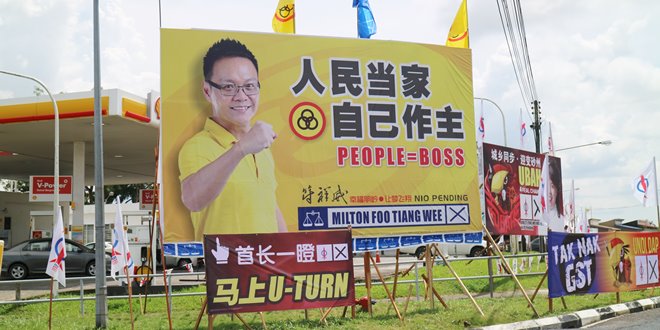 话说﹐砂人联党朋岭区候选人符祥威在肯雅兰园商业中心毗邻油站的路旁设立了一个黄色大型看板﹐并打出“人民当家﹐自己作主”的口号。
