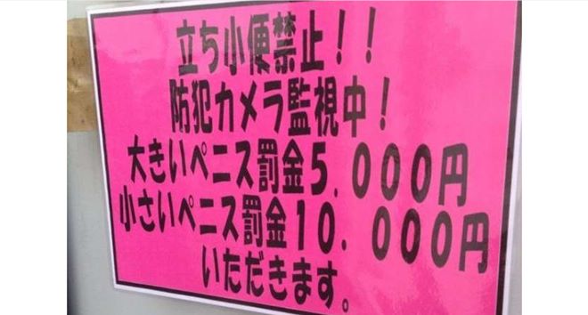 日本网友在推特上上传一张照片,照片显示一家电玩店的警告标语,提醒客人禁止随地大小便,内有监视器录影,并用男性生殖器做罚款金额的大小,写道「大鸡鸡罚5000(日圆),小鸡鸡罚10000(日圆),仅启。」