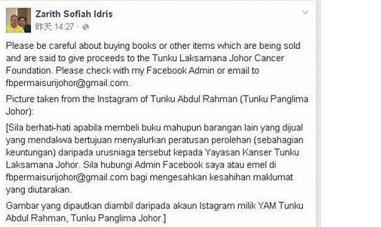 该基金会主席,也是柔佛王后拉惹查丽苏菲雅关注有人盗用「柔佛三王子癌症基金会」名义牟取私利的情况,昨日在本身面子书专页贴文提醒公眾提防受骗一事。