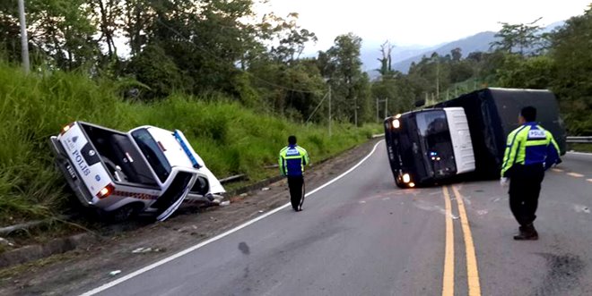 当时,共有约20多辆警察部队的四驱车和罗里排列而行,车内载有完成执行任务的警员,从拿笃返回亚庇途中,其中一辆警察四驱车煞车器失灵而酿祸。
