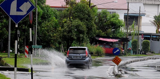 一场突如其来的大雨,造成市区多处地方积水,包括甘榜艾蒲路、东姑奥斯曼路和柯兰基路等,水满溢出路面,路人和车辆涉水而过。