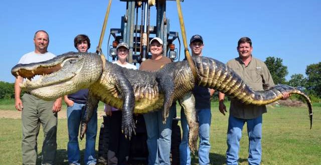 当地时间2013年9月5日消息(具体拍摄时间不详),美国密西西比河河流域,Beth Trammell与朋友花了将近12个小时才搞定眼前这条重达723磅重的短吻鳄;但随后其他上钩的短吻鳄更让他们惊讶,重达727磅重,两条均打破了密西西比州的纪录。据悉,当地的短吻鳄已经受政府保护,但每年会指派不同的人体验抓捕短吻鳄的乐趣。