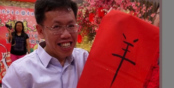 在较后受访时,他表示﹐本身已超过30年没有写毛笔字﹐于是﹐在紧张及兴奋之余﹐在昨晚就开始请教身边的人该选什么字来进行今日的挥春开幕礼,所幸获得一名记者提点﹐即以最简单的“羊”字,来向民众贺年﹗