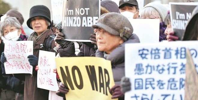 2014年安倍释放出修改宪法中「集体自卫权」的意愿。安倍指,现在很多日本人旅居海外或到海外,万一当地爆发爭端,日本人在搭乘美军船舰撤离的过程中可能遭受攻击。依据日本现行宪法的解释,由於不是日本领土遭受攻击,所以日本自卫队不能护卫美军军舰。