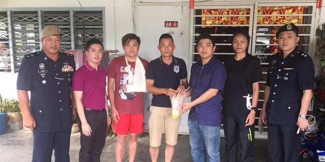 人联党古晋支部青年团团长刘世栋及秘书李顺健今日携同古晋警区副主任艾尼斯约翰前往遭到入屋抢劫的受害者住家慰问,同时移交水果礼品给受害者家属。