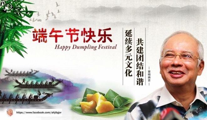 纳吉今日在阿jib哥面子书贴上图与文,祝贺我国华裔,端午节快乐。他在留言中如此表示。