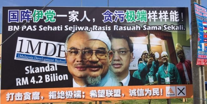 广告板的內容上端为「国阵伊党一家人,贪污极端样样能」,板下內容则印有「打击贪腐,拒绝极端;希望联盟,诚信为民」的字眼。