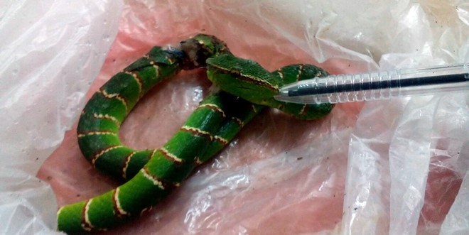 砂拉越中砂 割草右脚踝遭噬 工人杀毒蛇求医 2016年6月10日 伤者带着被斩杀的凤尾蛇到医院求医。 (本报诗巫10日讯)割草时遭有毒的凤蛇咬中右脚踝,男子杀蛇后带往医院求医。Advertisement 是名伊班男子35岁,住在加拿逸长屋。 据知,今早7时许他去长屋附近割野草,忽然感到右脚踝剧痛,他一看只见1只绿色的小蛇咬中他的脚踝。 大惊失色的他立即以手中利器砍杀该只绿色的蛇后,立即拿了蛇尸,由家人送他去诗巫医院急诊室求医。 经过治疗,他的情况稳定。
