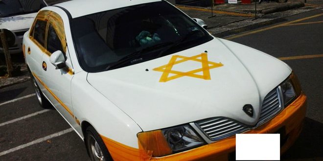 该女子拿来了黄色胶贴,粘在车子防撞杆上及车身上,在引擎盖上贴了1颗星星。