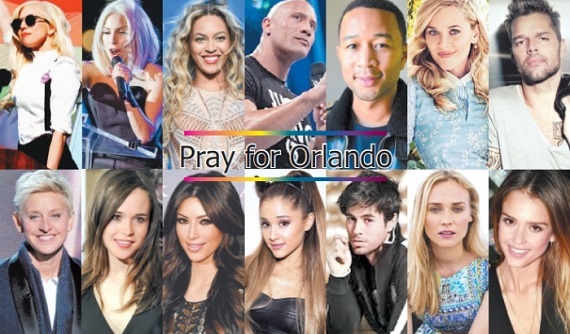 「电动马达」歷奇马汀(Ricky Martin)表示:「我是同志,我不害怕。爱会战胜一切!为奥兰多祈祷。」身为同志的名主持人艾伦狄珍妮(Ellen DeGeneres)在推特上传了「啜泣」,表达她的哀伤;出柜女星艾伦佩吉(Ellen Page)也在推特留言:「我的心与受害者和他们的家属同在,我们的社群遭受巨大损失,我们已以前更团结。」「丰臀金」金卡戴珊(Kim Kardashian)说:「我已经无话可说,我的心与祈祷与每个在奥兰多屠杀案的受害者同在。」22岁美国小天后雅瑞安娜格兰德(Ariana Grande)则留言:「太多暴力,伤了我的心,我尽全力散发光亮和爱,给每个我可以接触到的人。」