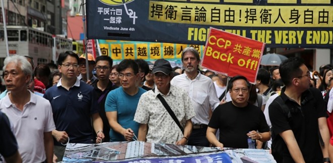 民主党立法会议员何俊仁等人发起的集会和游行,下午2时30分在铜锣湾书店大楼外举行,多个泛民主派政党响应,林荣基本人也出席,共约500人参与。队伍之后从铜锣湾东角道游行至西区中联办,他们沿途高叫「香港有底线,向强权说不」的口號。