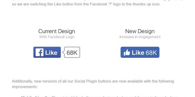 从上述照片可见,与之前面书的「f」標誌不同,点讚按钮有了大拇指新样貌。面书以两种设计做了一项质化与量化测试,使用大拇指图標时,使用者参与度增加6%,所以大拇指符號取代原有的点讚按钮(f標誌)。