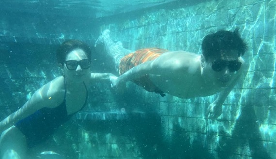 综合报导,赖斯翔8日在面子书晒出与老婆的游泳照,只见他单穿橘色泳裤,老婆则套上蓝色连身泳装、展现胸前雪白肌肤,夫妻俩连在泳池里也紧牵著手,还一边拍照一边在水中大摆姿势,看起来玩得相当开心。