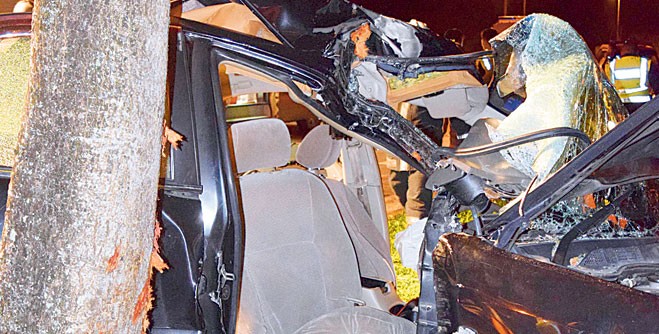 (本报美里5日讯)女子午夜开车回家,路经埔奕(国油油站)路段,车子打滑直撞路旁美化树,结果受困在车内。