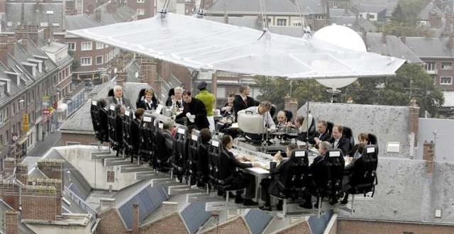 空中餐厅源自于比利时,餐桌长9米,宽5米,可以容纳22人,按时升至150英尺(约45.7公尺)的半空中,不过仍会依当天风速做调整。目前已经在超过40个城市巡回过,受到许多好评。