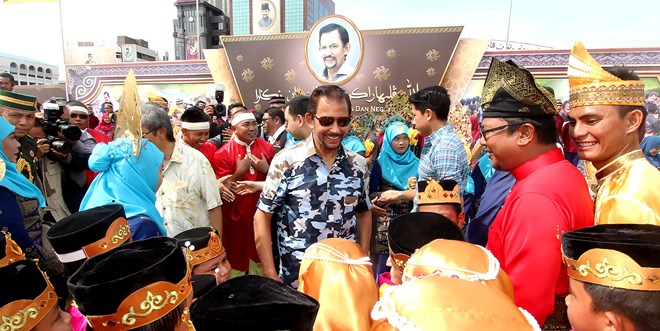(汶莱斯市24日讯)汶莱摩拉县今日上午在斯市奥玛阿里赛夫汀广场,举办苏丹陛下70岁华诞“与民同乐”活动,苏丹陛下哈山纳波基亚,在皇太子哈芝阿尔慕达迪比拉、本基兰阿都马力王子、本基兰阿都马汀王子本基兰莫哈末亲王以及皇室成员陪同下,亲临广场接受国民、游客、旅居汶莱的各国侨民的祝贺及祝福。