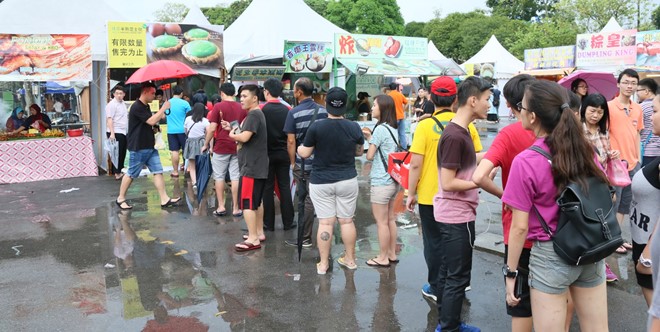 今日上午原本天气炎热,但傍晚时突然降雨导致前来美食节现场的民众大减,惟人人撑伞的情景也形成独特景色,人潮在雨势转小后也逐渐增加。