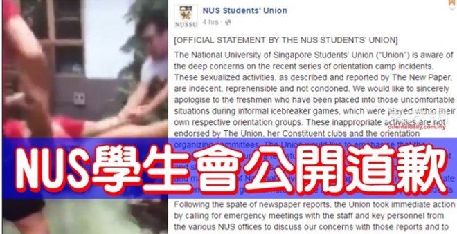 校方日前宣佈停止迎新活动,国大学生会週日(7月31日)也在面子书上公开道歉。