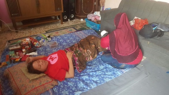 今年4月份,一个马来非政府组织得知诺依妮的情况后,每週都会上门家访一次,替诺依妮抹身及按摩,如今诺依妮的手已能抬起,话也说得比较清楚,但还不能行走,只能日夜躺在客厅。