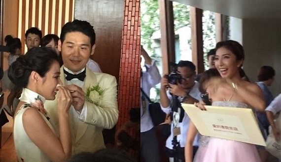 陈怡蓉婚宴26日一早先举行迎娶仪式,薛博仁前一晚几乎快失眠,身为伴娘的杨谨华当起尽责的主持人,列了10 个有关新娘的问题,没想到新郎第二题就答错,惩罚是穿高跟鞋走台步,体会当女生的辛苦。