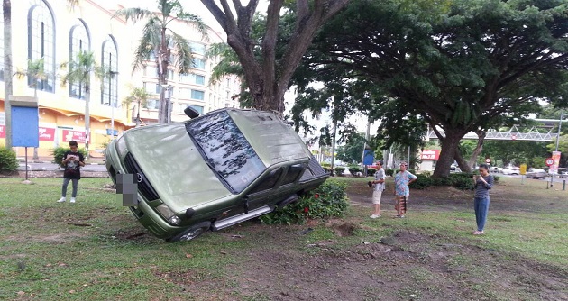 砂拉越北砂 闪避越界汽车 四驱车侧翻撞树 2016年9月30日 四轮驱动车为闪避车子,结果失控侧翻路面后撞美化树。 (本报美里30日讯)公公载孙子上学途中为闪避一辆突然越过其道路的车子,导致四轮驱动车失控侧翻后撞向一棵美化树,结果四驱车形成了“狗撒尿”的姿势。Advertisement 上述意外今日清晨约6时30分,于市区靠近百利达商业中心道路发生。 约60岁的男司机当时正载送13岁的孙子到学校,却在路上遇意外。 当时,因一辆轿车突然越过其道路,司机受到惊吓并作出闪避,结果四驱车失控翻覆路面后撞向一棵美化树。 尚幸两人在意外中没有受伤,但饱受惊吓。