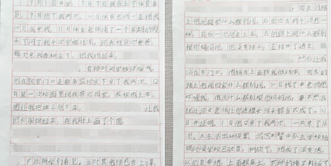 上面写道,「9月抱了我2次,10月一直抱我」、「10月底亲我」、「12月第一次在学校里说带我回家」、「他让我把裤子脱下来,让我把衣服掀起来,在我肚子上画了个圈」。