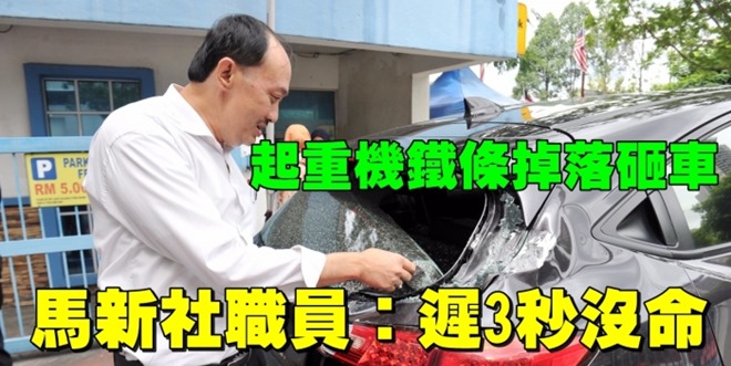 《马新社》內部审计经理鲁安努亚(47岁)表示,该支铁条相信是从工地的一架起重机上掉下来,不偏不倚砸中他的丰田轿车后镜,把他嚇一跳。