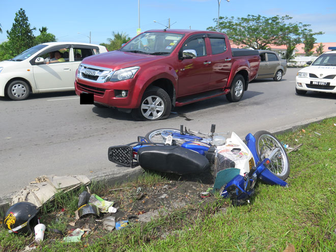 (本报美里13日讯)一辆四轮驱动车因违反交通规则,在捷道快速转弯,结果不慎撞倒一辆摩托车,导致男骑士身受皮外伤。